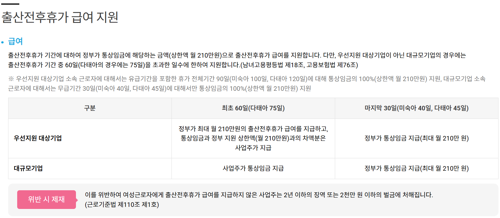 출산전후휴가 급여 지원 (https://worklife.kr/website/index/m4/worker_pay.asp)